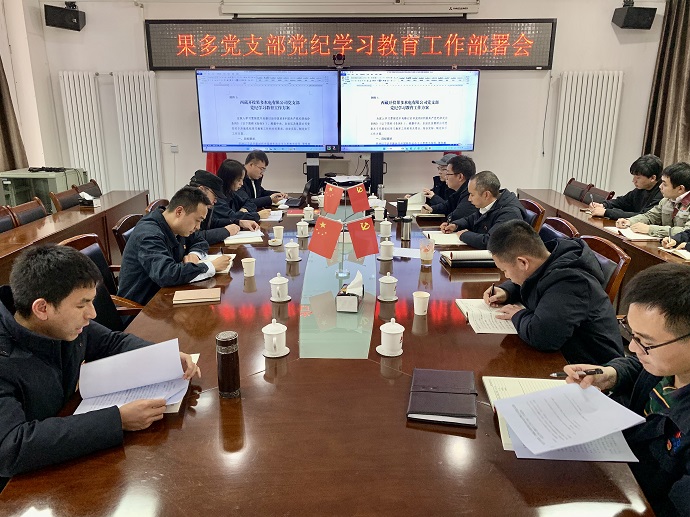 4月19日,果多水電公司黨支部召開黨紀學習教育工作部署會,傳達學習習近平總書記關于黨紀學習教育的重要講話、重要指示精神;蔡奇、李希4月3日在中央黨的建設工作領導小組第六次會議上的講話精神;王君正書記4月11日在主持召開自治區黨委常委會(擴大)會議上的講話精神;王君正書記4月15日在自治區黨委理論學習中心組黨紀學習教育讀書班上的講話精神;集團公司黨委黨紀學習教育安排部署會會議精神;宣讀果多水電公司黨支部黨紀學習教育工作方案,支部書記宋亞東對黨紀學習教育工作進行安排部署。