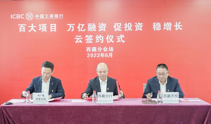為深入貫徹黨中央“疫情要防住、經濟要穩住、發展要安全”重要決策部署,提升助力經濟穩增長服務水平,6月9日下午,中國工商銀行總行舉行了“百大項目 萬億融資 促投資 穩增長”云簽約儀式。西藏開發投資集團有限公司作為西藏自治區簽約重點客戶之一,在中國工商銀行西藏分會場簽訂清潔能源項目在“十四五”期間提供不超過100億元等值人民幣意向性融資額度合作協議。