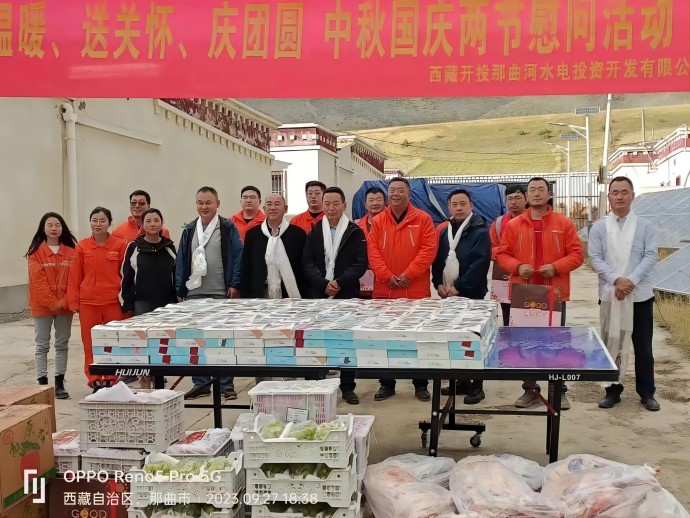 9月27日,西藏開投那曲河水電開發(fā)投資有限公司組織開展送溫暖、送關(guān)懷、慶團圓中秋國慶兩節(jié)慰問活動,集團公司副總經(jīng)理尼瑪出席活動,那曲河公司總經(jīng)理何驍及其它相關(guān)人員參加。