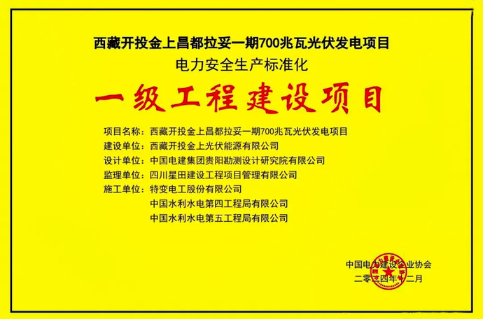 西藏開投金上拉妥一期700MW光伏發電項目于2021年12月13日取得備案批復文件,2024年12月底主體工程建設完成,具備并網發電條件,并于當年12月順利通過電力建設工程安全生產標準化一級評審,榮獲中國電力建設企業協會頒發的“電力安全生產標準化一級工程建設項目”榮譽。