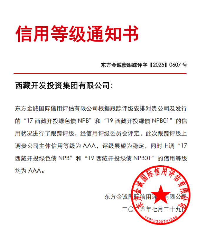 7月29日,經國內權威信用評級機構(東方金誠國際信用評估有限公司)評審認定,西藏開發投資集團有限公司(以下簡稱“西藏開投集團”)獲評AAA主體信用等級,評級展望為“穩定”,成為自治區第一家國有AAA企業,標志著自治區成功培育出首家本地主體信用等級AAA企業,填補了我區最高等級國有信用主體的空白。