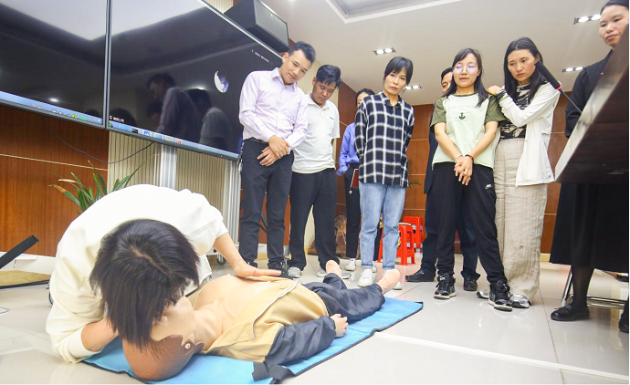 培訓過程中,導師通過示范指導、疑問解答、模擬訓練等方式,著重演示了海姆立克急救法、心肺復蘇操作、防震減災地震自救以及創傷救護等現場救護操作方法,著重強調了應急救護“黃金四分鐘”及心肺復蘇胸外按壓的至關重要性,全體參訓人員在導師的指導下對所學項目進行模擬練習,對不規范的流程與動作,進行糾正,確保參訓人員真正掌握應急救護技術。