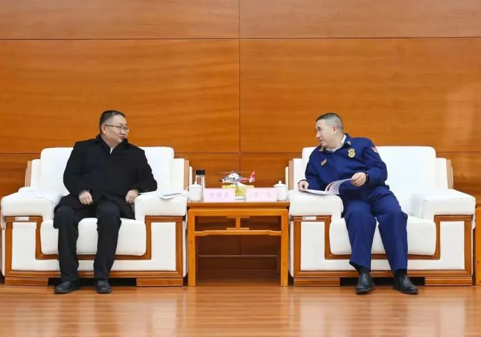 (祁騰武與區消防救援總隊總隊長王崗開展座談 松贊攝)