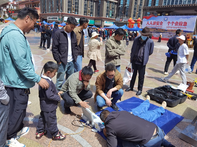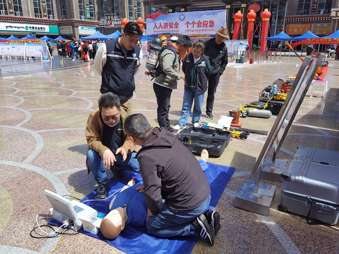 本次活動,果多水電公司向市民展示了心肺復蘇法操作演示、正壓式空氣呼吸器和安全帶等應急救援器材的正確使用方法。昌都市委常委、常務副市長吳應海,昌都市政府副秘書長張耀暉,昌都市應急管理局黨委書記霍映章一行到果多水電公司安全宣傳展臺參觀了心肺復蘇法演示,并對果多水電公司本次活動給予好評。