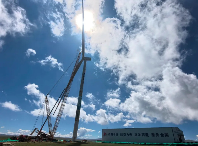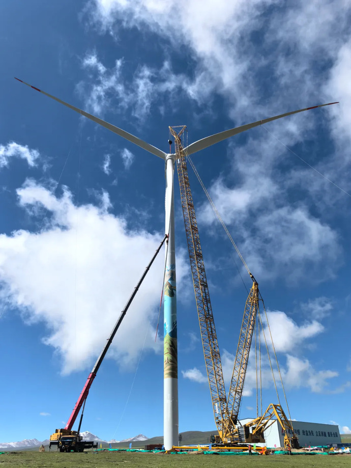 7月5日,海拔4700m的藏北高原,在一臺800T履帶式起重機與兩臺100T汽車起重機輔助下,西藏開投色尼區曲果嘎姆200MW風電項目13#風機風力發電機組葉片與輪轂緩緩升起,于10:45順利與機艙完成對接,標志著該項目首臺風機順利完成吊裝。