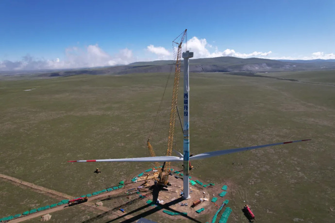 面對超高海拔、極低空氣密度、嚴寒缺氧、生態脆弱等困難挑戰,項目團隊優化了風機葉片氣動外形與材料抗低溫性能,首次實現單機5MW級風機在4900米海拔的模塊化集成設計。同時,通過生物酶催化軟基固結試驗,篩選耐低溫酶系,構建“酶-土-溫度”動態反應模型,即優化了沼澤區道路固化參數,也最大限度減少對生態脆弱地區的草甸破壞及生態擾動。