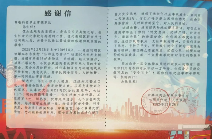 2025年12月25日上午,一輛載有46立方米危化品的油罐車在阿朗鄉(xiāng)布崗村發(fā)生側(cè)翻,司乘人員受傷,危化品存在泄漏、燃爆重大風(fēng)險(xiǎn),嚴(yán)重威脅人民群眾生命財(cái)產(chǎn)及周邊生態(tài)環(huán)境安全。接報(bào)后,公司兼職消防隊(duì)聞令而動(dòng)、火速馳援,第一時(shí)間抵達(dá)現(xiàn)場(chǎng)開(kāi)展處置。