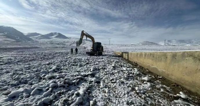 現(xiàn)場(chǎng)工作人員在冰雪覆蓋的灌區(qū)進(jìn)行清淤工作。