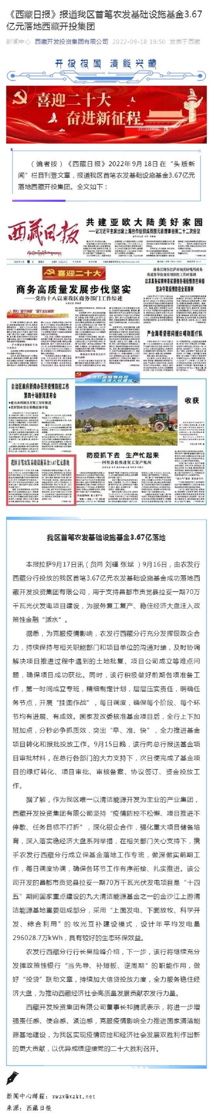 《西藏日報》報道我區首筆農發基礎設施基金3.67億元落地西藏開投集團
