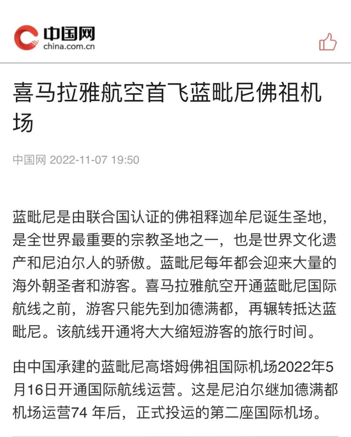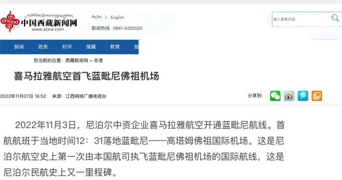 (編者按) 2022年11月4日至9日,中華網、中國網、中企網、中青網、中國日報網、光明日報、騰訊網、新浪網、搜狐網、今日頭條、中國旅游新聞網、中國西藏新聞網、拉薩新聞網、西藏生活網、西藏視窗、每日經濟西藏、西藏途游網等媒體報道了《喜馬拉雅航空首飛藍毗尼佛祖機場》文章。摘要如下: