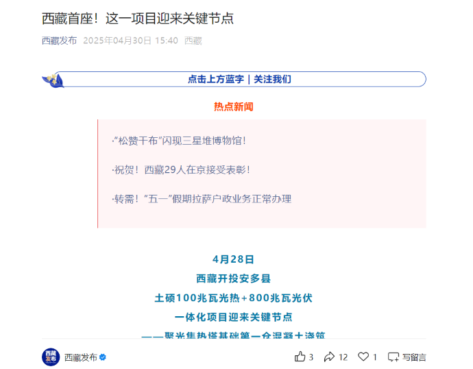 近日,西藏首個(gè)光熱示范工程——西藏開投安多土碩光熱一體化項(xiàng)目建設(shè)迎來關(guān)鍵節(jié)點(diǎn)的消息,被中國發(fā)展網(wǎng)、西藏日報(bào)、西藏發(fā)布等各級媒體平臺(tái)宣傳報(bào)道,提升了集團(tuán)品牌影響力和產(chǎn)業(yè)發(fā)展的傳播力。