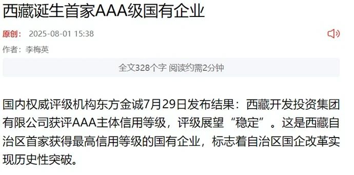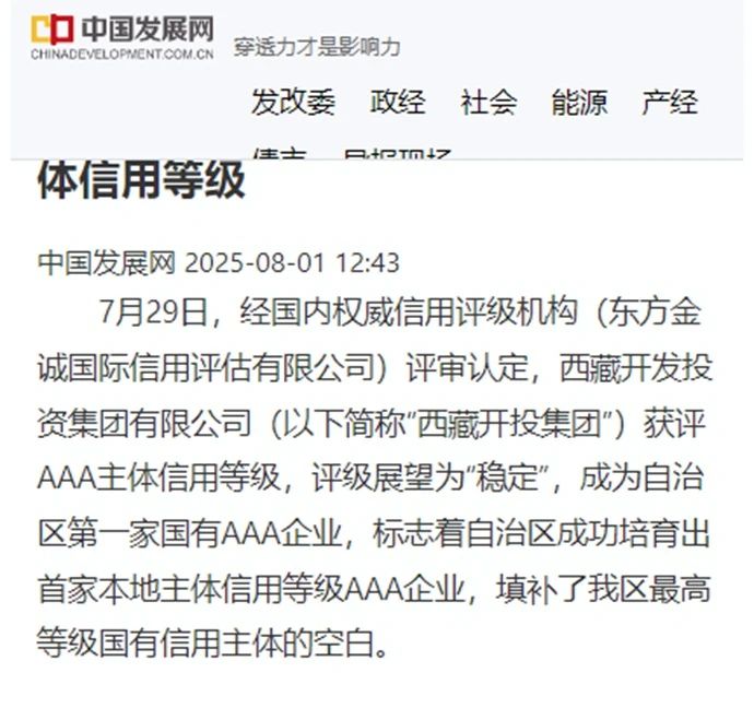 近期,中國發展網、西藏日報客戶端、西藏商報等媒體聚焦報道西藏開發投資集團有限公司獲評AAA主體信用等級消息。7月29日,經國內權威信用評級機構(東方金誠國際信用評估有限公司)評審認定,西藏開發投資集團有限公司獲評AAA主體信用等級,評級展望為“穩定”,成為自治區第一家國有AAA企業,標志著自治區成功培育出首家本地主體信用等級AAA企業,填補了我區最高等級國有信用主體的空白。