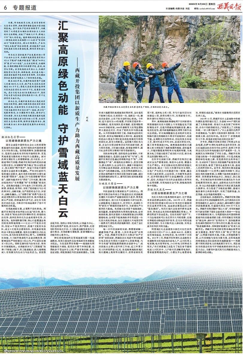 8月28日,《西藏日報》以題為《匯聚高原綠色動能 守護雪域藍天白云——西藏開投集團以新質生產力助力西藏高質量發展》的整版文章,專題報道了西藏開投集團近年來致力國企改革、發展新質生產力,推動西藏清潔能源產業高質量發展的階段性成績。一起來看詳細報道↓↓↓。