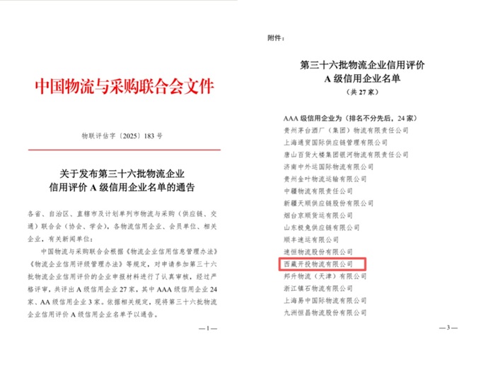 近日,中國物流與采購聯合會公布了第三十六批物流企業信用評價A級信用企業名單,西藏開投物流有限公司獲評“AAA級信用企業”。