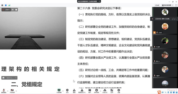 培訓圍繞集團公司章程規定、部門職責、三重一大規定三個方面作了系統講解,著重從合法、合規性方面進行了分析。此次培訓,有效促進了制度建設工作的法治化和規范化。下一步,集團公司將結合上級要求,持續加強制度管理體系的建設,優化管理流程,筑牢集團公司高質量發展基石。