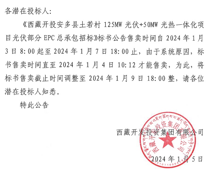 關于延長《西藏開投安多縣土若村125MW光伏+50MW光熱一體化項目光伏部分EPC總承包招標》標書售賣時間的公告