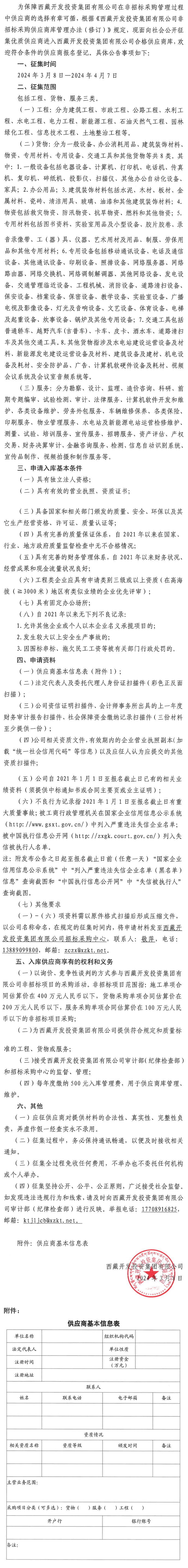 西藏開發投資集團有限公司非招標采購供應商人庫征集公告