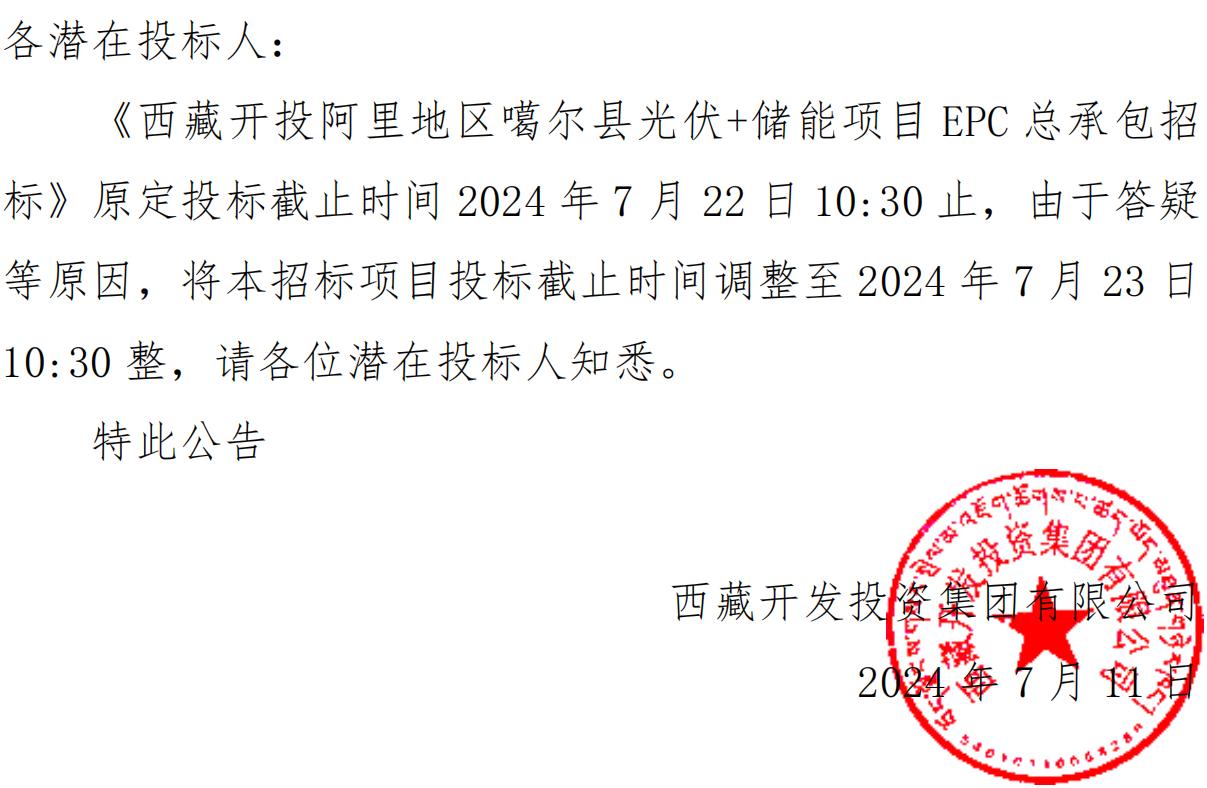 關(guān)于延長《西藏開投阿里地區(qū)噶爾縣光伏+儲能項(xiàng)目EPC總承包招標(biāo)》投標(biāo)截止時間的公告