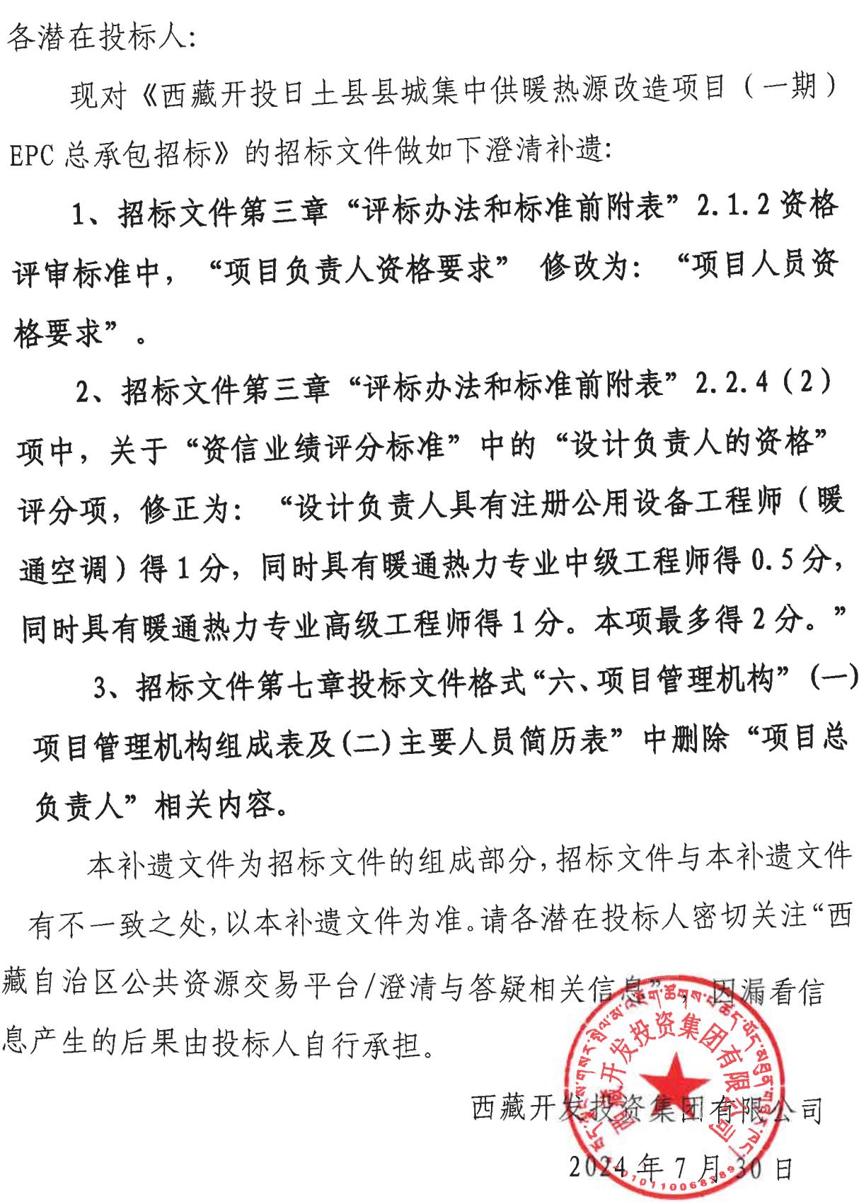 EPC總承包招標補遺(01)號