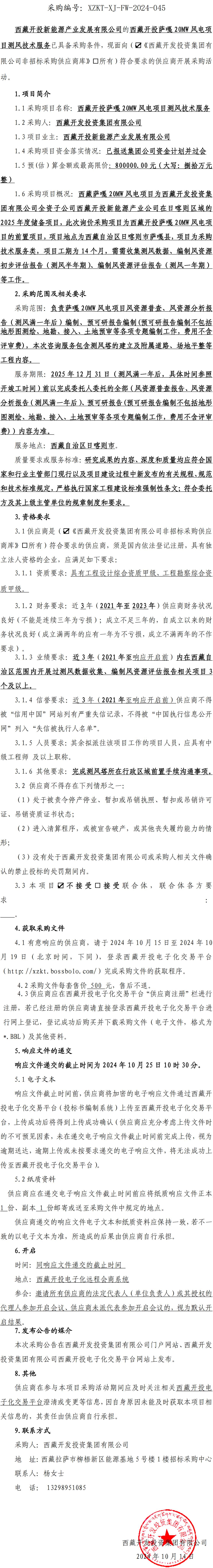 西藏開投薩嘎 20MW 風電項目測風技術服務詢價采購公告