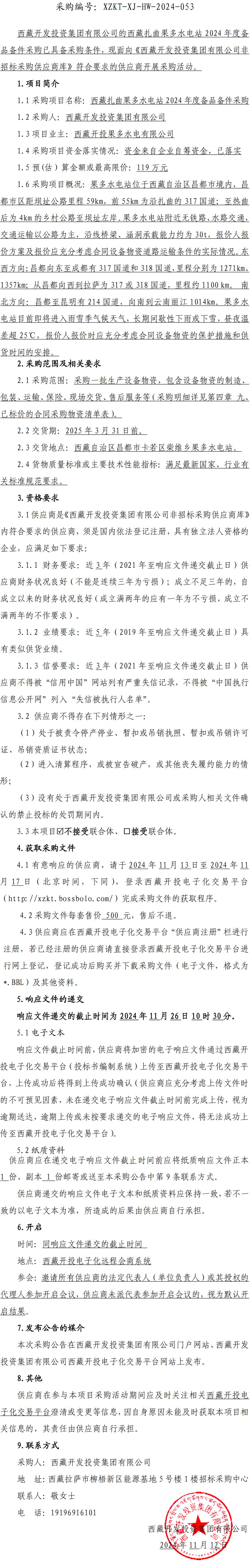 西藏扎曲果多水電站 2024 年度備品備件采購詢價采購公告
