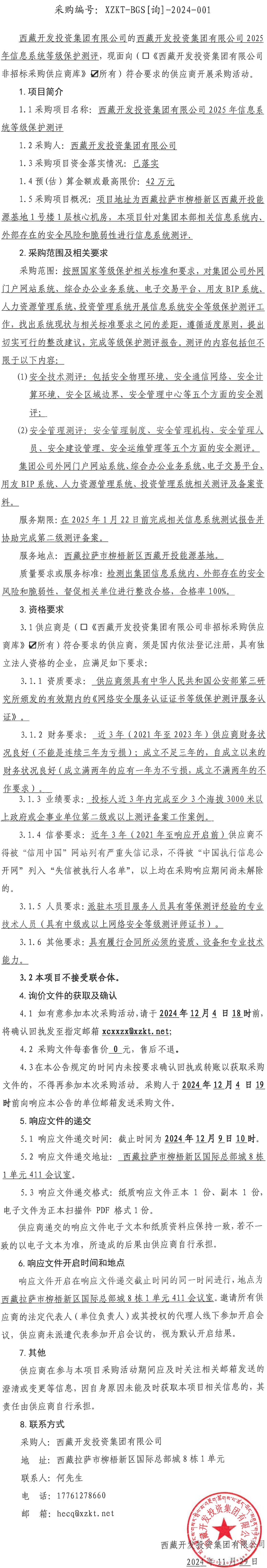 西藏開發投資集團有限公司2025年信息系統等級保護測評詢價采購公告