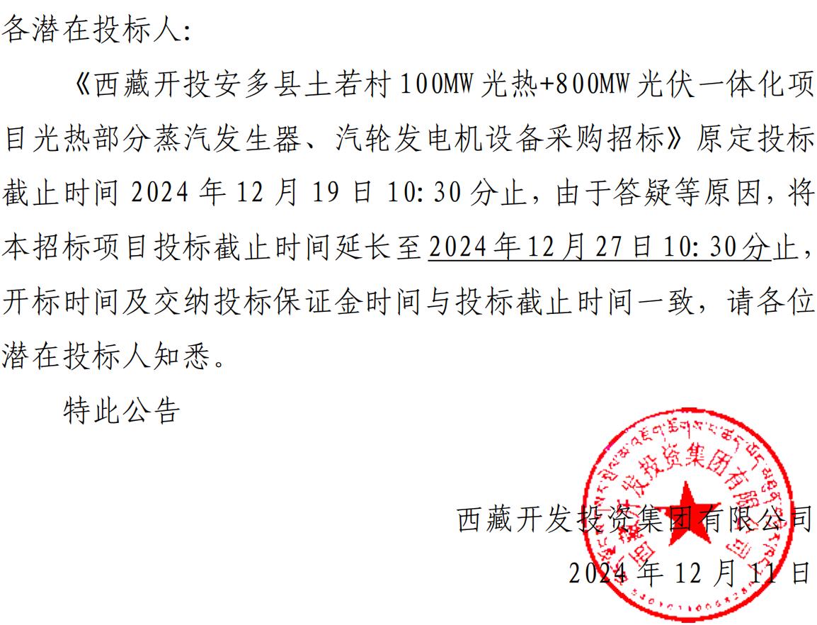 關(guān)于延長《西藏開投安多縣土碩 100MW 光熱+800MW 光伏一 體化項(xiàng)目光熱部分蒸汽發(fā)生器、汽輪發(fā)電機(jī)設(shè)備采購招標(biāo)》投 標(biāo)截止時間的公告