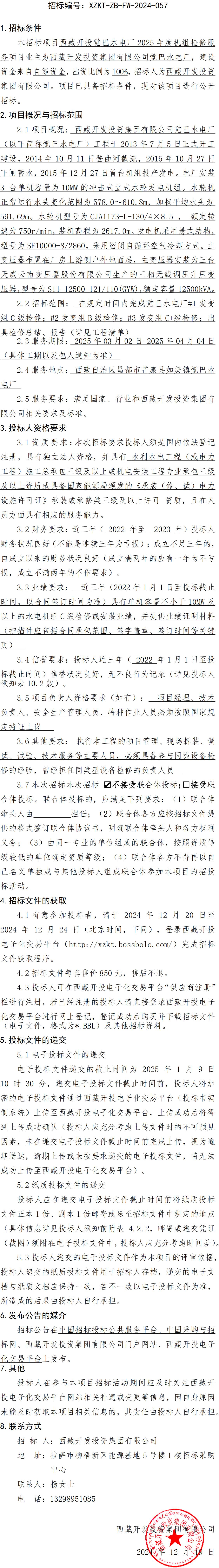西藏開投覺巴水電廠 2025 年度機組檢修服務招標公告