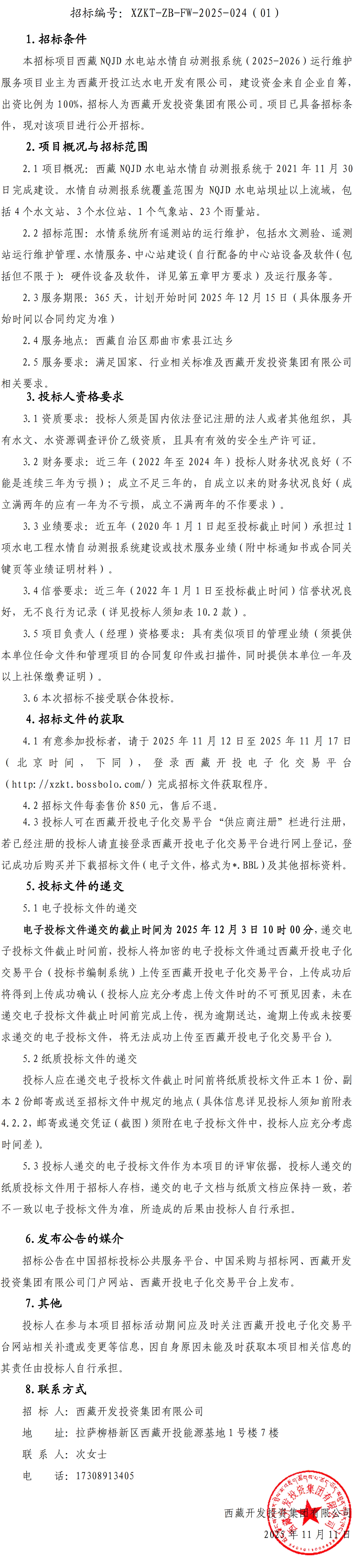 西藏NQJD水電站水情自動測報系統(2025-2026)運行維護服務(二次)招標公告